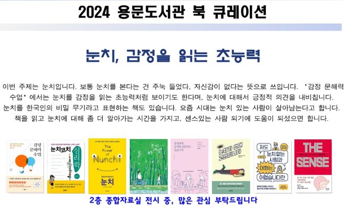 (정도일보) 양평군 용문도서관은 다음달 31일까지 북큐레이션을 운영한다고 밝혔다. 이번 북큐레이션의 주제는 ‘눈치, 감정을 읽는 초능력’으로, 눈치에 관한 도서를 선별해 추천한다.