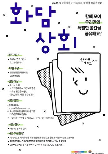 ‘2024 모든공간31’'사업명 : 화담상회'는 다양한 문화 주체의 참여와 협력을 지원하고자 공모를 추진 중에 있으며, 오산 시민들이 생활권 내에서 자유로운 문화 활동을 펼치고 향유할 수 있도록 관내 민간문화공간들을 지원하여 지역 문화의 거점 공간으로 운영·발전시키고자 하는 사업이다.