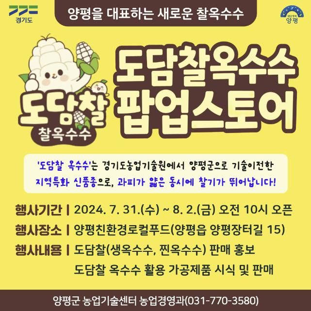 (정도일보) 양평군이 찰옥수수 신품종 ‘도담찰’을 홍보하기 위해 이달 31일부터 다음달 2일까지 양평로컬푸드에서 팝업스토어를 운영한다.