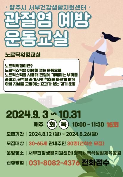 (정도일보) 양주시가 오는 8월 12일부터 관내 30세부터 65세 시민을 대상으로 ‘2024년 2기 관절염 예방 운동 교실(노르딕워킹 교실)’ 참여자 30명을 선착순 모집한다고 밝혔다.