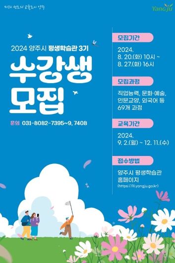 (정도일보) 양주시가 오는 20일부터 27일까지 시민들에게 평생교육의 기회를 제공하기 위한 ‘2024년 제3기 평생학습관 프로그램’ 수강생을 모집한다고 밝혔다.