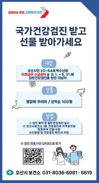 이벤트 참여 방법은 일반건강검진을 받은 후, 증빙서류(건강검진확인서 또는 건강검진 결과지와 신분증)를 지참해서 오산시보건소 3층 건강증진과 지역보건팀을 방문하면 된다.