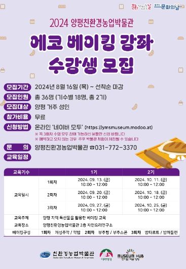 양평친환경농업박물관 관계자는 “에코-베이킹 강좌는 지역 주민들의 관심이 높고 지역 특상물과 생산물을 알리는 좋은 기회”라며 “많은 분들이 참여해 지역 특산물을 활용한 베이킹의 매력을 경험해보시길 바란다”고 전했다.