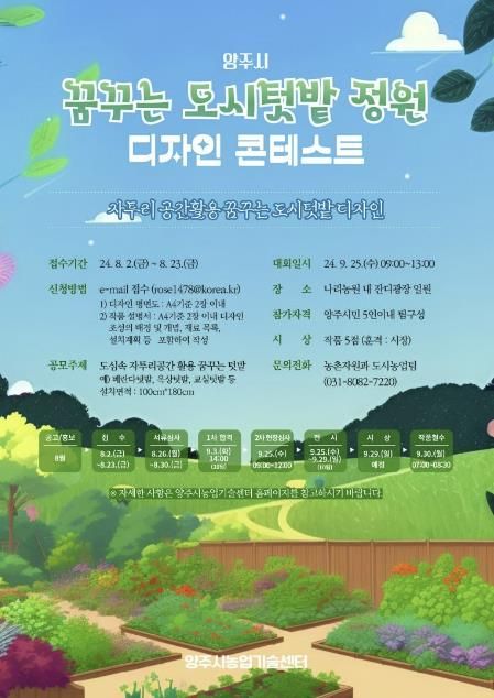 참가 방법은 신청서 및 텃밭 정원 평면도를 첨부해 이메일로 접수하면 되며 기타 자세한 내용은 양주시농업기술센터 누리집 공지사항 또는 양주시 농촌자원과 도시농업팀으로 문의하면 된다.