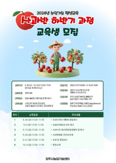 (정도일보) 양주시는 오는 16일까지 ‘2024년 농업기술 평생 교육’의 하나인 ‘사과반 하반기 과정’ 교육생을 모집한다고 6일 밝혔다.