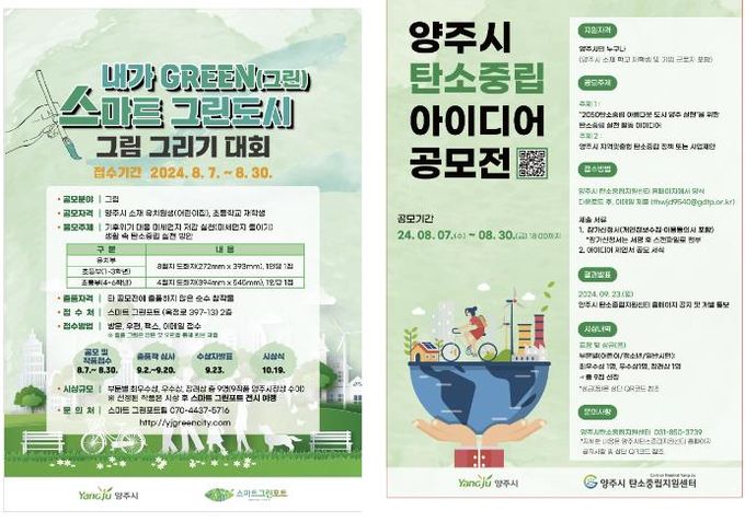 공모 분야는 ▲내가 GREEN(그린) 스마트 그린도시(이하 그림), ▲양주시 탄소중립 아이디어(이하 제안) 등 2개 분야로 ▲기후 위기 대응 미세먼지 저감 실천, ▲생활 속 탄소중립 실천 방안, ▲지역 맞춤형 탄소중립 정책 제안 등 전반적인 대기 환경 분야를 주제로 다룬다.
