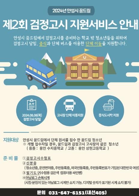 (정도일보) 안성시학교밖청소년지원센터는 오는 8월 8일 경기도 용인에서 진행되는 2024년 제2회 검정고시 지원서비스를 제공한다고 밝혔다.