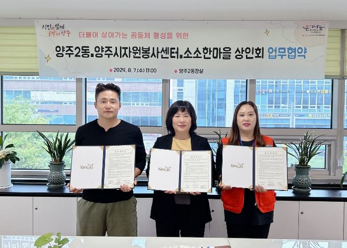 (정도일보) 양주2동이 지난 7일 양주시자원봉사센터 및 소소한 마을상인회와 함께 더불어 살아가는 공동체 형성이라는 공동 목표로 업무협약을 체결했다고 밝혔다.