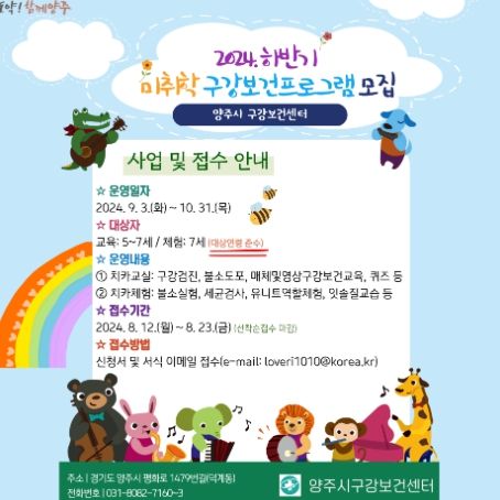 (정도일보) 양주시가 오는 12일부터 23일까지 관내 구강보건센터에서 ‘하반기 똑똑이 치카 교실 및 재미있는 치카 체험’ 프로그램 참여자를 모집한다고 밝혔다.
