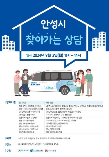 (정도일보) 안성시는 오는 9월 2일 11시부터 14시까지 하나로마트 안성농협 본점 앞에서 안성시민을 대상으로 ‘2024년 하반기 찾아가는 주거복지 이동상담’을 운영한다고 밝혔다.