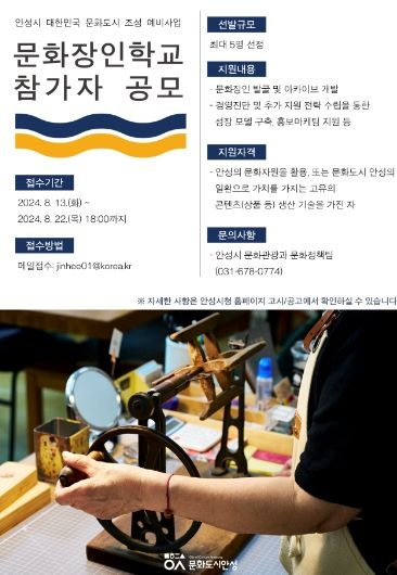 (정도일보) 안성시는 전통‧문화‧예술‧관광 분야의 사업자들을 대상으로 시장에 통용될 수 있는 경쟁력 있는 문화 비즈니스 창출, 육성하는 하반기 ‘문화장인학교’의 참여자를 오는 8월 22일까지 모집한다.