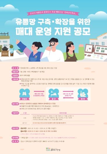 (정도일보) 안성시가 대한민국 문화도시 조성 예비사업의 일환으로 진행됐던 ‘문화장인학교’를 통해 도출된 문화장인들의 개별 프로젝트 결과물을 판매‧전시하기 위한 매대 운영 지원 사업의 참여자를 오는 8월 27일까지 모집한다.