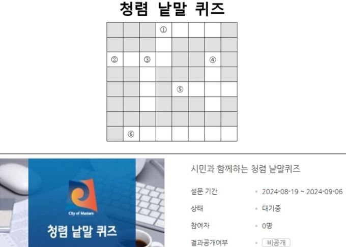 이번 낱말 퀴즈는 청렴과 관련된 다양한 주제를 활용해 시민 누구나 쉽고 재밌게 풀어볼 수 있도록 할 예정이며, 안성시청 누리집(홈페이지)을 통해 참여할 수 있다.