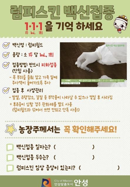 (정도일보) 안성시는 럼피스킨 백신 자가 접종 농가를 위하여 농가 실정에 맞게 자체 제작한 정확한 럼피스킨 백신 접종요령을 일제 배포하였다.