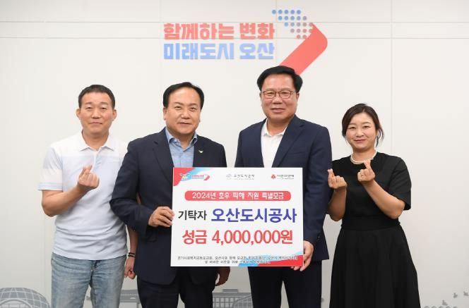 공사가 마련한 구호성금 400만원은 ▲ CEO를 포함한 임직원 ▲ 오산시민의 자발적 성금 모금 ▲ 공사 전직원의 '사랑의 마음모으기+' 사회공헌기금 ▲ 노동조합의 기금 조성을 통하여 마련되었으며, 경기사회복지공동모금회를 통해 수해복구 지원이 필요한 지역과 주민들에게 소중히 전달될 예정이다.