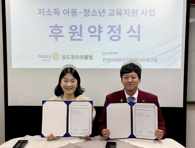 (정도일보) 사회복지법인 한길복지재단에서 수탁 운영하는 안성시서부무한돌봄네트워크팀은 국제로타리 3600지구 공도로타리클럽과 지난 20일 저소득 아동·청소년 교육 지원 사업 후원 약정식을 개최했다.