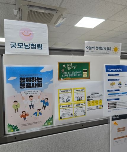 이어, ‘굿모닝 청렴 게시판’에 ▲청렴 포스터 게시, ▲갑질 사례 및 신고 절차 안내, ▲책 속의 청렴 찾기 등 직원들이 일상에서 청렴의 의미를 되새길 수 있는 자료를 지속해서 게재할 예정이라고 설명했다.