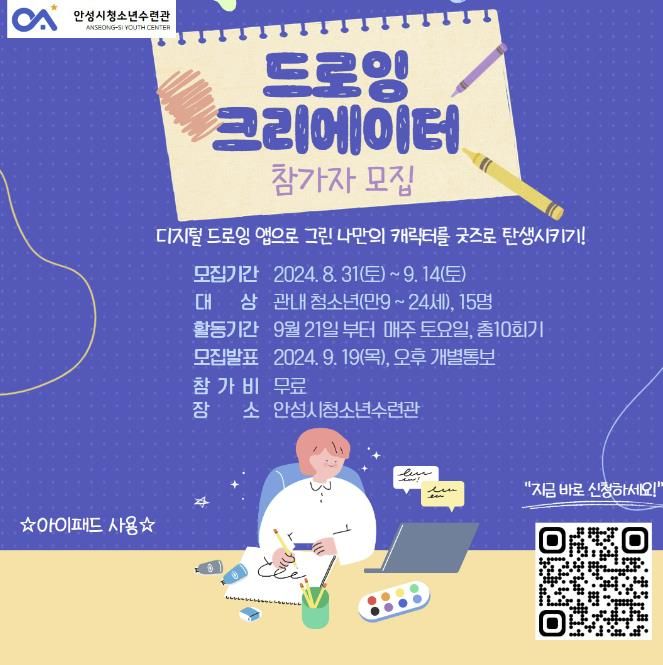 (정도일보) 안성시청소년수련관은 제7차 청소년정책 기본계획을 반영, 청소년의 디지털 역량 강화 활동을 제공하고자 관내 청소년을 대상으로 ‘드로잉 크리에이터’ 프로그램을 운영한다.