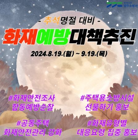 (정도일보) 양주소방서는 다가오는 추석 연휴를 대비하여 오는 9월19일까지 ‘추석 명절 대비 화재예방대책‘을 추진한다고 밝혔다.