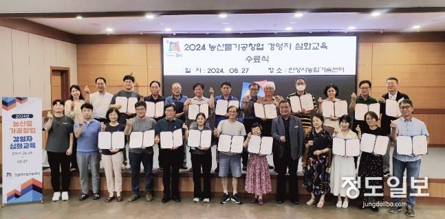 (정도일보) 안성시농업기술센터는 농업인의 생산 농산물을 활용한 상품 개발과 농산물가공지원센터 기반시설을 이용하여 가공을 통한 농가의 성공적인 창업 기반을 마련하기 위해 지난 5월 25일부터 시작한 농산물가공창업 경영자 심화교육이 8월 27일 성황리에 마무리되었다고 밝혔다.