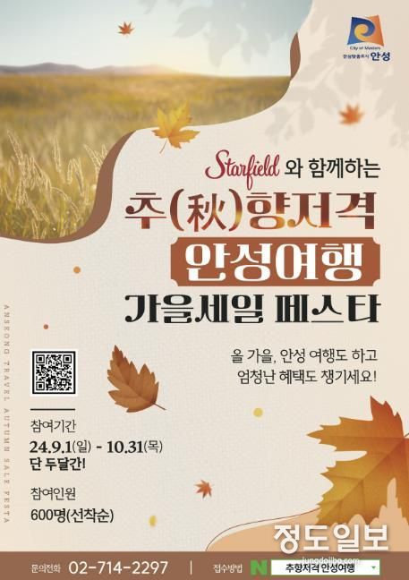 (정도일보) 안성시는 여행의 계절 가을을 맞이하여 관광객들을 위한 특별한 행사, ‘추(秋)향저격 안성여행 가을세일 페스타’를 오는 9월부터 10월까지 2개월간 운영한다고 밝혔다.