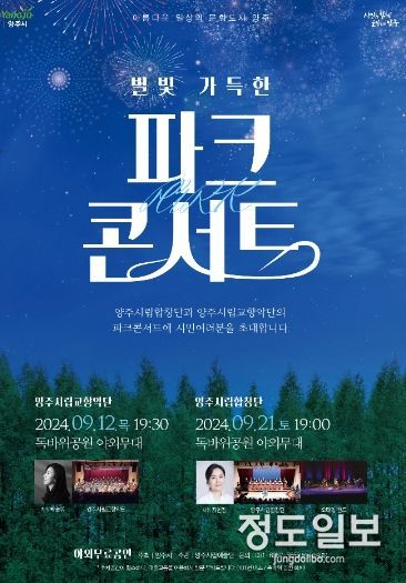 (정도일보) 양주시는 9월 12일과 9월 21일, 이틀간 독바위공원 야외무대에서 2024년 양주시립예술단 '별빛 가득한 파크콘서트'를 개최한다고 밝혔다.
