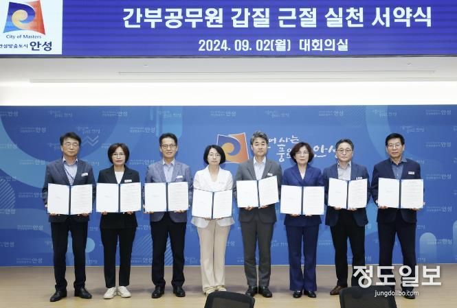 (정도일보) 안성시는 지난 2일, 시청 대회의실에서 시장 및 부시장, 5급 이상 간부 공무원 60여 명이 참석한 간부공무원 갑질 근절 실천 서약식을 개최했다.
