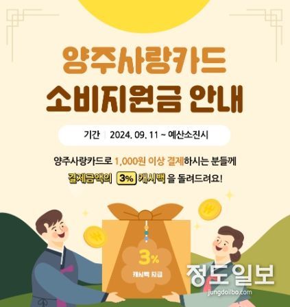 (정도일보) 양주시는 추석을 맞아 지역경제 회복과 소비 진작을 위해 ‘양주사랑상품권(양주사랑카드) 소비지원금 이벤트’를 진행한다고 4일 밝혔다.