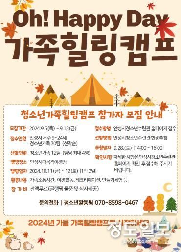 (정도일보) 2024년 8월 개관한 안성시 청소년수련관에서 청소년(9~24세)자녀를 둔 안성시 가족을 대상으로 오는 9월 13일까지 ‘가족힐링캠프’ 참가자를 모집한다.