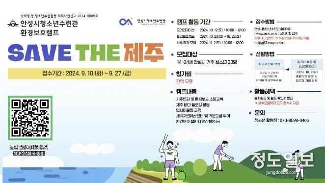 (정도일보) 안성시청소년수련관에서는 9월 10일 화요일부터 안성시 관내 중·고·대학생을 대상으로 환경보호캠프 ‘SAVE THE 제주’ 참가자를 모집한다.