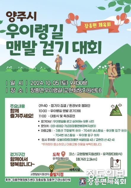 (정도일보) 양주시가 장흥면체육회(회장 김성재)에서 시민 건강 증진 및 우이령 홍보를 위해 ‘2024년 장흥면 우이령 맨발 걷기대회’를 오는 10월 5일 개최한다고 밝혔다.