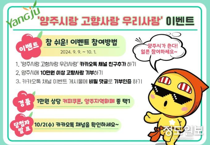 (정도일보) 양주시가 오는 10월 1일까지 양주시 고향사랑기부에 동참한 이들에게 감사를 전하기 위해 특별 이벤트를 진행한다.