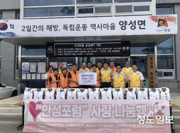 (정도일보) 안성포럼(대표 김영기)에서는 지난 11일 양성면에서 수확한 쌀로 추석맞이 이웃돕기 양곡 10kg 120포를 경기 사랑의열매를 통해 양성면 취약계층을 위해 양성면지역사회보장협의체에 지정기탁했다.