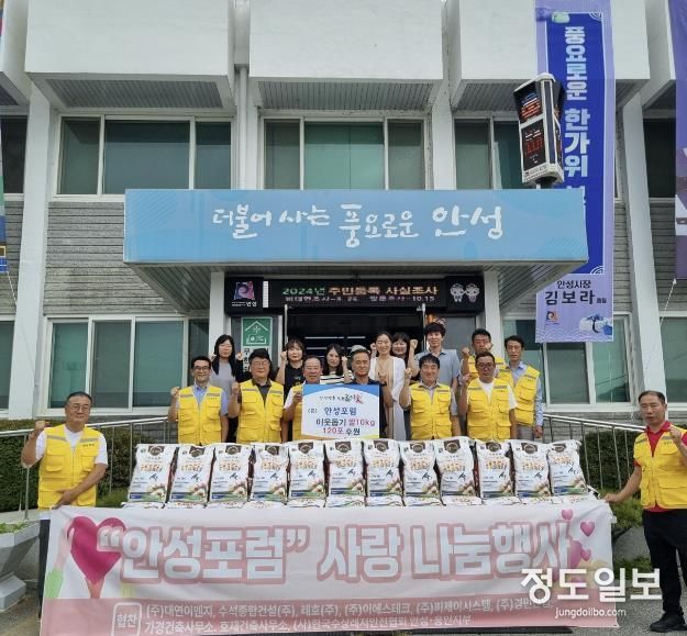 안성포럼은 안성시 발전과 지역사회를 위해 사업을 하고 있으며, 다양한 나눔과 지속적인 봉사활동을 펼쳐오고 있는 비영리단체이다. 2022년에 쌀 500kg, 지난해에도 쌀 1,200kg 등을 기부하였고 올해 초에도 쌀 1,000kg를 기부한 바 있다.
