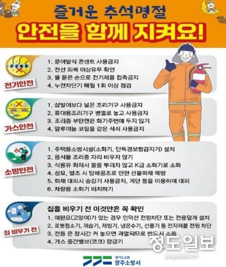 (정도일보) 양주소방서는 온 가족이 화재로부터 안전한 추석 명절을 보내기 위해 화재안전수칙 준수를 당부드린다고 밝혔다.