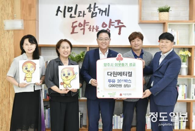 (정도일보) 양주시가 지난 19일 다원메디컬에서 시청을 방문해 양주시 어려운 이웃을 위해 써달라며 두유 201박스(환가액 200만원 상당)를 기부했다고 밝혔다.