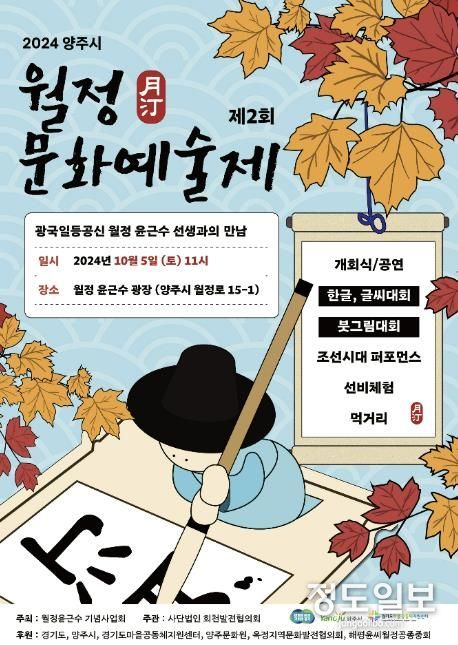 (정도일보) 양주시가 오는 10월 5일 월정윤근수 광장(양주시 월정로 15-1)에서 ‘2024년 제2회 월정문화예술제’가 개최된다고 밝혔다.