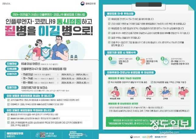 또한, 65세 이상 어르신은 신분증을 지참해 지정의료기관에 방문하면 코로나19와 인플루엔자 백신을 동시 접종할 수 있다.