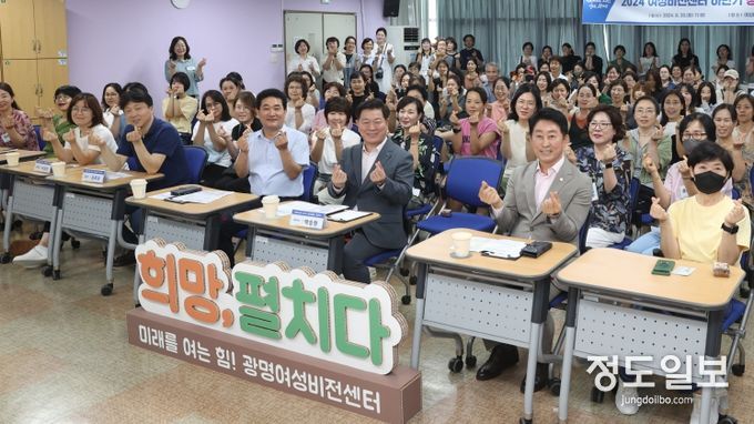 지난 8월 20일 오전 여성비전센터에서 열린 '2024년 하반기 정규과정 개강식'에 박승원 광명시장(앞줄 오른쪽에서 세 번째)이 참석해 참석자들과 기념사진을 촬영하고 있다.