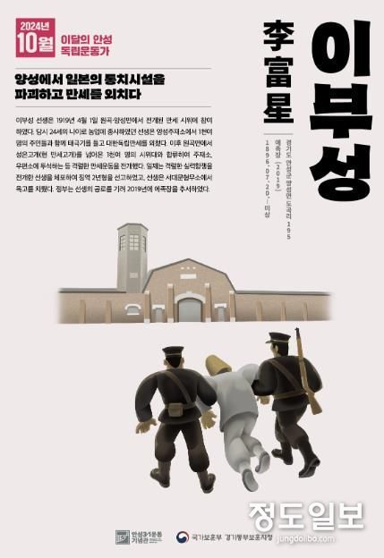 (정도일보) 안성시와 국가보훈부 경기동부보훈지청은 공동으로 안성3.1독립만세운동에 참여한 독립운동가 이부성(李富星)선생을 '2024년 10월 이달의 안성 독립운동가'로 선정했다.