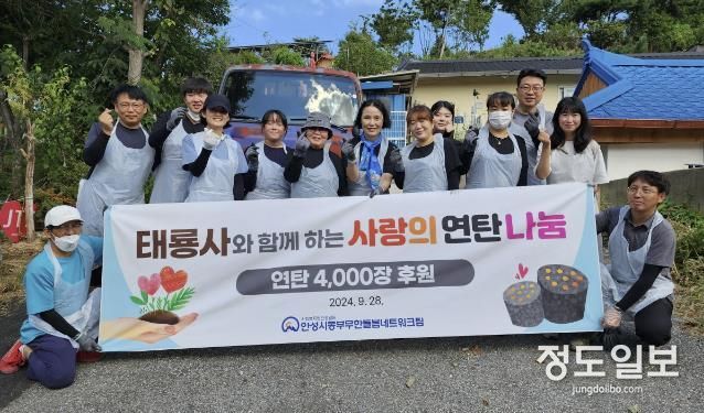 (정도일보) 안성시동부무한돌봄네트워크팀은 지난 28일 태룡사 후원으로 난방 취약계층 8가정에 4,000장 연탄 나눔을 실천했다.