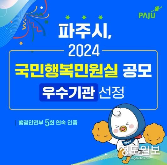 (정도일보) 파주시는 ‘2024년 국민행복민원실’ 공모에서 우수기관으로 선정되어 행정안전부 장관상을 수상한다.