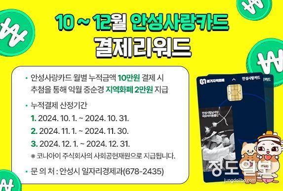 (정도일보) 경기지역화폐 운영대행사 코나아이(주)는 지역경제 활성화 정책의 일환으로 안성사랑카드 한 달 누적결제금액 10만원 이상 사용자를 대상으로 추첨을 통해 2만원 안성사랑카드 포인트를 지급할 계획이다.