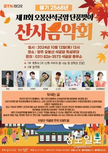 양주시가 오는 12일 관내 오봉산 석굴암 특설무대에서 ‘제11회 석굴암 단풍맞이 산사음악회’가 개최된다고 밝혔다.