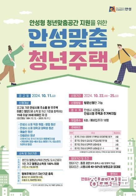 (정도일보) 안성시는 11일 안성형 청년맞춤 주거공간 지원사업인 ‘2024 하반기 안성맞춤 청년주택’ 입주자 모집을 시작한다고 밝혔다.