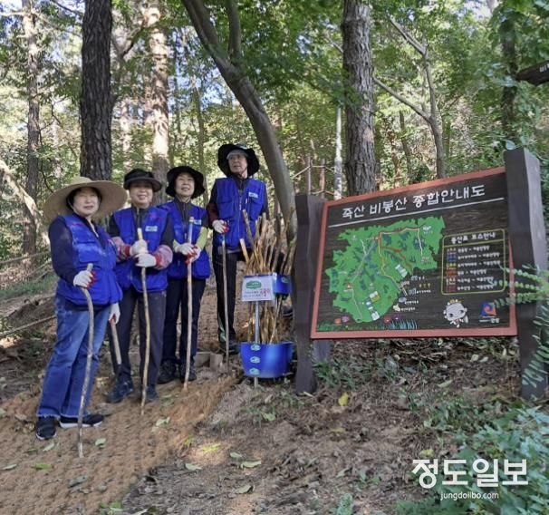 (정도일보) 죽산면 행복마을관리소의 지킴이들은 비봉산 등산로의 환경정비를 하면서 얻은 폐목으로 등산객이 사용할 수 있는 지팡이와 의자를 만드는 사업을 진행하였다.