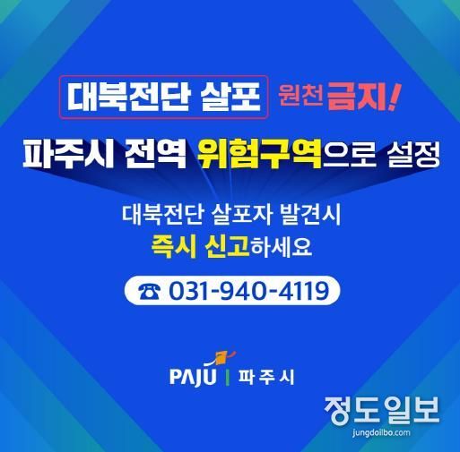 (정도일보) 파주시는 경기도가 10월 16일 파주시 전역을 위험구역으로 설정, 공고함에 따라 시민들의 생명과 안전을 위협하는 대북전단 살포 행위에 대해 강력하게 대응할 것을 천명했다.