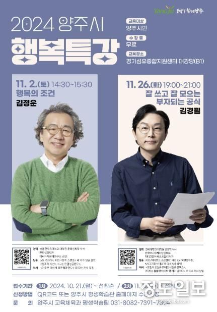 (정도일보) 양주시가 오는 11월 문화심리학자 김정운 박사, 금융·경제 전문가 김경필 머니트레이너와 함께 시민들과 경험과 지식을 나누는 ‘2024 양주시 행복특강’을 개최한다고 밝혔다.
