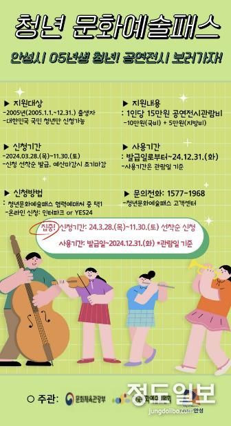 (정도일보) 안성시가 안성시에 주소지를 둔 19세(2005년생) 청년들에게 공연·전시 관람 기회를 제공하기 위해 ‘청년문화예술패스’ 사업을 진행하고 있다.