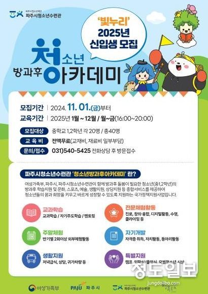 (정도일보) (재)파주시청소년재단 파주시청소년수련관 청소년방과후아카데미 활동에 참여할 2025년 신입생을 모집한다.